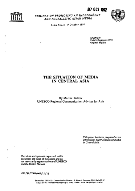 Seminar on Promoting Independent and Pluralistic Asian Media (Alma-Ata) UNESCO (1992), 29 pp.