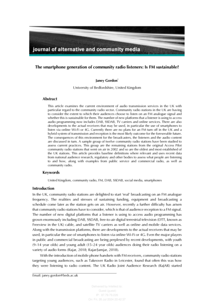 "This article examines the current environment of audio transmission services in the UK with particular regard to the community radio sector. Community radio stations in the UK are having to consider the extent to which their audiences choose to listen on an FM analogue signal and whether this is sustainable for them. The number of new platforms that a listener is using to access audio programming now includes DAB, SSDAB, TV carriers and online services. There are also developments to the actual receivers that may be used, in particular the use of smartphones to listen via online Wi-Fi or 4G. Currently there are no plans for an FM turn off in the UK and a hybrid system of transmission and reception is the most likely outcome for the foreseeable future. The consequences of this environment for the broadcasters, the listeners and the audio content are discussed in turn. A sample group of twelve community radio stations have been studied to assess current practices. This group are the remaining stations from the original Access Pilot community radio stations that went on air in 2002 and so are the oldest and most established of the UK stations. This article provides baseline definitions where relevant and uses recent data from national audience research, regulatory and other bodies to assess what people are listening to and how, along with examples from public service and commercial radio, as well as community radio." (Abstract)