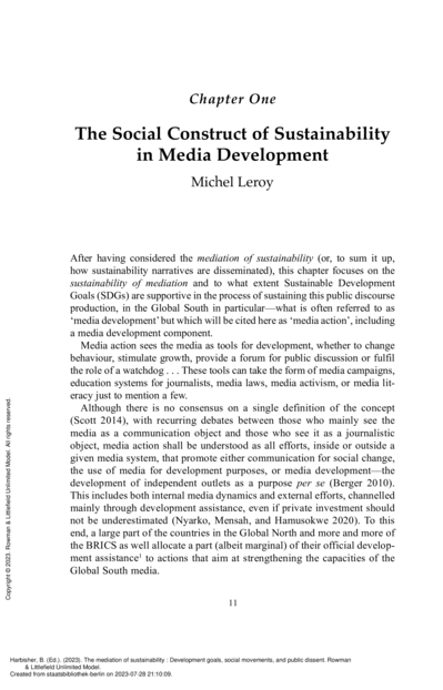 "After having considered the mediation of sustainability (or, to sum it up, how sustainability narratives are disseminated), this chapter focuses on the sustainability of mediation and to what extent Sustainable Development Goals (SDGs) are supportive in the process of sustaining this public discourse production, in the Global South in particular—what is often referred to as ‘media development’ but which will be cited here as ‘media action’, including a media development component. Media action sees the media as tools for development, whether to change behaviour, stimulate growth, provide a forum for public discussion or fulfil the role of a watchdog ... These tools can take the form of media campaigns, education systems for journalists, media laws, media activism, or media literacy just to mention a few." (Page 11)