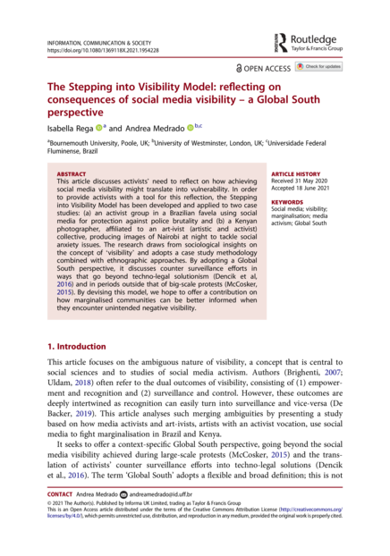 "This article discusses activists’ need to reflect on how achieving social media visibility might translate into vulnerability. In order to provide activists with a tool for this reflection, the Stepping into Visibility Model has been developed and applied to two case studies: (a) an activist group in a Brazilian favela using social media for protection against police brutality and (b) a Kenyan photographer, affiliated to an art-ivist (artistic and activist) collective, producing images of Nairobi at night to tackle social anxiety issues. The research draws from sociological insights on the concept of ‘visibility’ and adopts a case study methodology combined with ethnographic approaches. By adopting a Global South perspective, it discusses counter surveillance efforts in ways that go beyond techno-legal solutionism (Dencik et al, 2016) and in periods outside that of big-scale protests (McCosker, 2015). By devising this model, we hope to offer a contribution on how marginalised communities can be better informed when they encounter unintended negative visibility." (Abstract)