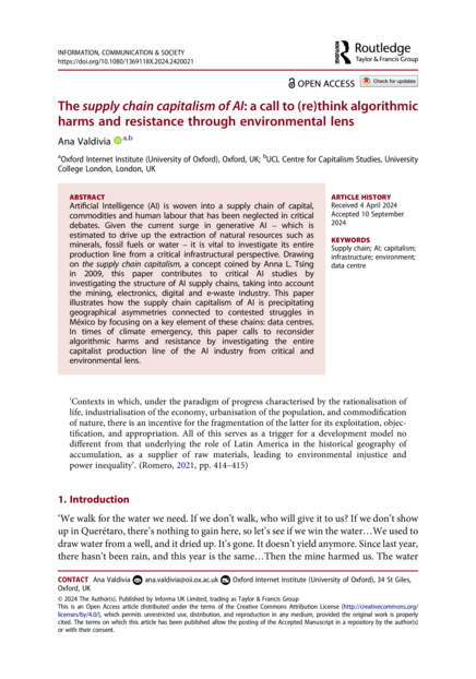 "Artificial Intelligence (AI) is woven into a supply chain of capital, commodities and human labour that has been neglected in critical debates. Given the current surge in generative AI – which is estimated to drive up the extraction of natural resources such as minerals, fossil fuels or water – it is vital to investigate its entire production line from a critical infrastructural perspective. Drawing on the supply chain capitalism, a concept coined by Anna L. Tsing in 2009, this paper contributes to critical AI studies by investigating the structure of AI supply chains, taking into account the mining, electronics, digital and e-waste industry. This paper illustrates how the supply chain capitalism of AI is precipitating geographical asymmetries connected to contested struggles in México by focusing on a key element of these chains: data centres. In times of climate emergency, this paper calls to reconsider algorithmic harms and resistance by investigating the entire capitalist production line of the AI industry from critical and environmental lens." (Abstract)