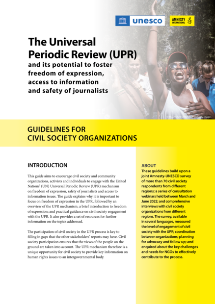 "This guide aims to encourage civil society and community organizations, activists and individuals to engage with the United Nations' (UN) Universal Periodic Review (UPR) mechanism on freedom of expression, safety of journalists and access to information issues. The guide explains why it is important to focus on freedom of expression in the UPR, followed by an overview of the UPR mechanism; a brief introduction to freedom of expression; and practical guidance on civil society engagement with the UPR. It also provides a set of resources for further information on the topics addressed. These guidelines build upon a joint Amnesty-UNESCO survey of more than 70 civil society respondents from different regions; a series of consultation webinars held between March and June 2022; and comprehensive interviews with civil society organizations from different regions." (Introduction, page 1)
