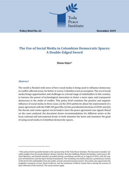 "The world is flooded with news of how social media is being used to influence democracy in conflict-affected areas, for better or worse. Colombia is not an exception. The era of social media brings opportunities and challenges to a broad range of stakeholders in this country, to harness the power of technological innovation to foster a more open and transparent democracy in the midst of conflict. This policy brief examines the positive and negative influence of social media in three cases: (i) the 2016 plebiscite about the endorsement of a peace agreement with the FARC-EP guerrilla; (ii) the presidential elections of 2018; and (iii) the threats and crimes against social leaders since the peace agreement was signed. Based on the cases analysed, the document draws recommendations for different actors at the local, national and international levels, to both minimise the harm and maximise the good of using social media in Colombian democratic spaces." (Abstract)