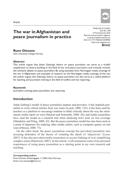 "This article argues that Johan Galtung’s theory on peace journalism can serve as a fruitful supplement to theory-building in the field of war and peace journalism, and critically reviews the scholarly debate on peace journalism. By using examples from Norwegian media coverage of the war in Afghanistan and examples of research on the Norwegian media coverage of the war, the author argues that Galtung’s theory on peace journalism can also serve as a useful platform for teaching and journalism training in the field of conflict and war reporting." (Abstract)