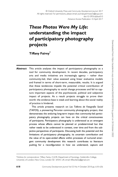 "This article presents research on Los Talleres de Fotografia Social (TAFOS), a pioneering Peruvian community photography project, that demonstrates the enduring long-term impact that community-led participatory photography projects can have on the critical consciousness of participants. Participatory photography is understood as an emergent process whose effects cannot be planned or predetermined but that rather needs to be understood in context, over time and from the subjective perspectives of participants. Discussing both the potential and the limitations of participatory photography, its uncertain contribution and the value of its open-ended effects within processes of nurtured emergent community development this research contributes to literature pushing for a reconfiguration in how we understand, capture and attribute the impact of participatory photography, and participatory arts and media more broadly, as a tools for social change." (Abstract)