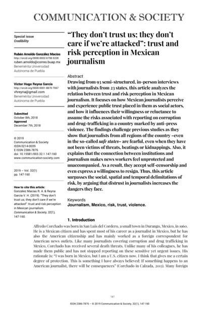 "Drawing from 93 semi-structured, in-person interviews with journalists from 23 states, this article analyzes the relation between trust and risk perception in Mexican journalism. It focuses on how Mexican journalists perceive and experience public trust placed in them as social actors, and how it influences their willingness or reluctance to assume the risks associated with reporting on corruption and drug-trafficking in a country marked by anti-press violence. The findings challenge previous studies as they show that journalists from all regions of the country –even in the so-called safe states– are fearful, even when they have not been victims of threats, beatings or kidnappings. Also, it explains that the connection between institutions and journalism makes news workers feel unprotected and unaccompanied. As a result, they accept self-censorship and even express a willingness to resign. Thus, this article surpasses the social, spatial and temporal delimitations of risk, by arguing that distrust in journalists increases the dangers they face." (Abstract)