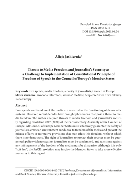 "Free speech and freedom of the media are essential to the functioning of democratic systems. However, recent decades have brought phenomena that pose a threat to media freedom. The author analyzed threats to media freedom and journalist’s security regarding resolution 2317 (2020) of the Parliamentary Assembly of the Council of Europe. All Council of Europe Member States must effectively guarantee the safety of journalists, create an environment conducive to freedom of the media and prevent the misuse of laws or normative provisions that may affect this freedom, without which there is no democracy. The right of journalists to protect their sources must be guaranteed; police violence against journalists must be condemned, and sanctions against any infringement of the freedom of the media must be dissuasive. Although it is only “softlaw”, the PACE resolution may inspire the Member States to take more effective measures in this regard." (Abstract)