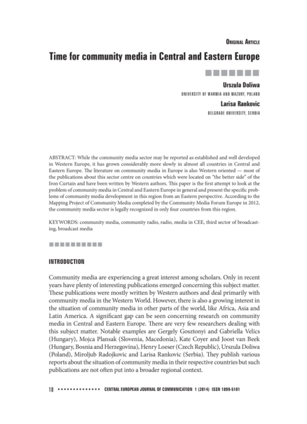 "This paper is the first attempt to look at the problem of community media in Central and Eastern Europe in general and present the specific problems of community media development in this region from an Eastern perspective. According to the Mapping Project of Community Media completed by the Community Media Forum Europe in 2012, the community media sector is legally recognized in only four countries from this region." (Abstract)
