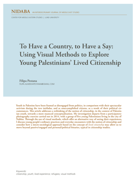 "Youth in Palestine have been framed as disengaged from politics, in comparison with their spectacular activism during the two intifadas, and as unaccomplished citizens, as a result of their political circumstances. This article addresses a rethinking of the notion of citizenship, in the context of Palestinian youth, towards a more nuanced conceptualization. My investigation departs from a participatory photography exercise carried out in 2014, with a group of five young Palestinians living in the city of Nablus. Through the use of visual methods, which offer an alternative way of seeing their experiences, I discuss young people’s ordinary practices and everyday encounters with the notion of citizenship and consider how a micro-sociological approach based on the concept of lived citizenship may allow us to move beyond passive/engaged and personal/political binaries, typical in citizenship studies." (Abstract)