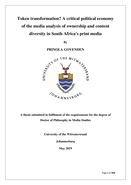 Token Transformation? A Critical Political Economy of the Media Analysis of Ownership and Content Diversity in South Africa's Print Media