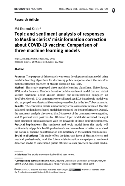 "This study employed three machine learning algorithms, Naïve Bayes, SVM, and a Balanced Random Forest to build a sentiment model that can detect Muslim sentiment about Muslim clerics’ anti-misinformation campaign on YouTube. Overall, 9701 comments were collected. An LDA-based topic model was also employed to understand the most expressed topics in the YouTube comments. Results: The confusion matrix and accuracy score assessment revealed that the balanced random forest-based model demonstrated the best performance. Overall, the sentiment analysis discovered that 74 percent of the comments were negative, and 26 percent were positive. An LDA-based topic model also revealed the eight most discussed topics associated with ten keywords in those YouTube comments. Practical implications: The sentiment and topic model from this study will particularly help public health professionals and researchers to better understand the nature of vaccine misinformation and hesitancy in the Muslim communities." (Abstract)
