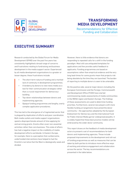 "This report draws on the feedback of media development actors to present a set of recommendations for both donors and implementing agencies. These include proposed improvements to the development and roll-out of funding programmes as well as measures that can be taken by both parties to introduce more effective ways of working and enhance engagement and collaboration across the sector." (Page 1)