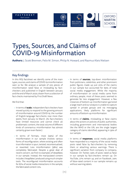 "In this RISJ factsheet we identify some of the main types, sources, and claims of COVID-19 misinformation seen so far. We analyse a sample of 225 pieces of misinformation rated false or misleading by factcheckers and published in English between January and the end of March 2020, drawn from a collection of fact-checks maintained by First Draft News." (Key findings)