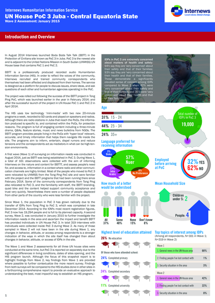 "In August 2014 Internews launched Boda Boda Talk Talk (BBTT) in the Protection of Civilians site known as PoC 3 in Juba. PoC 3 is the newest site and is adjacent to the United Nations Mission in South Sudan (UNMISS) UN House base that contains PoC 1 and PoC 2. BBTT is a professionally produced recorded audio Humanitarian Information Service (HIS). In order to reflect the voices of the community, Internews recruited and trained community correspondents who themselves had been affected and displaced from their homes [...] A first wave (Wave 1) of surveying on information needs was conducted in August 2014 [...] Since Wave 1, the population in PoC 3 has grown radically [...] Wave 2, was conducted in January 2015 to further investigate the information needs in the area and ascertain the impact and benefit BBTT has provided individuals in UN House PoC 3. In total 319 interviews with individuals were collected." (Introduction)