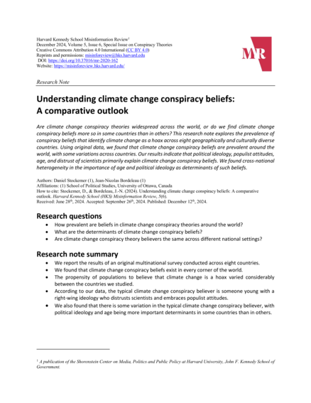 "Are climate change conspiracy theories widespread across the world, or do we find climate change conspiracy beliefs more so in some countries than in others? This research note explores the prevalence of conspiracy beliefs that identify climate change as a hoax across eight geographically and culturally diverse countries. Using original data, we found that climate change conspiracy beliefs are prevalent around the world, with some variations across countries. Our results indicate that political ideology, populist attitudes, age, and distrust of scientists primarily explain climate change conspiracy beliefs. We found cross-national heterogeneity in the importance of age and political ideology as determinants of such beliefs." (Abstract)