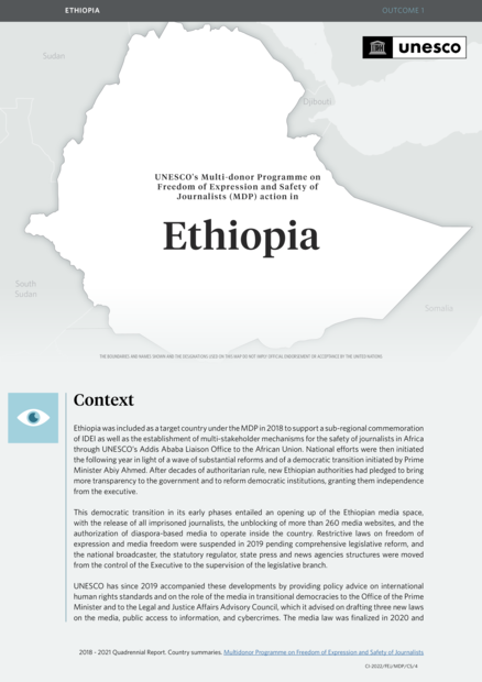 UNESCO's Multi-Donor Programme on Freedom of Expression and Safety of Journalists (MDP) Action in Ethiopia: 2018-2021 Quadrennial Report, Country Summaries