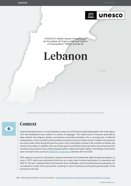 UNESCO's Multi-Donor Programme on Freedom of Expression and Safety of Journalists (MDP) Action in Lebanon: 2018-2021 Quadrennial Report, Country Summaries