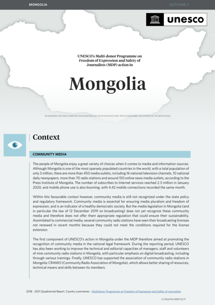 UNESCO's Multi-Donor Programme on Freedom of Expression and Safety of Journalists (MDP) Action in Mongolia: 2018-2021 Quadrennial Report, Country Summaries