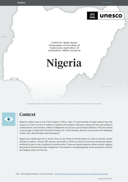 UNESCO's Multi-Donor Programme on Freedom of Expression and Safety of Journalists (MDP) Action in Nigeria: 2018-2021 Quadrennial Report, Country Summaries