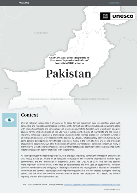 UNESCO's Multi-Donor Programme on Freedom of Expression and Safety of Journalists (MDP) Action in Pakistan: 2018-2021 Quadrennial Report, Country Summaries
