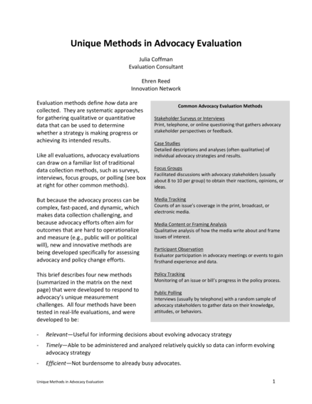 "Like all evaluations, advocacy evaluations can draw on a familiar list of traditional data collection methods, such as surveys, interviews, focus groups, or polling. But because the advocacy process can be complex, fast-paced, and dynamic, which makes data collection challenging, and because advocacy efforts often aim for outcomes that are hard to operationalize and measure (e.g., public will or political will), new and innovative methods are being developed specifically for assessing advocacy and policy change efforts. This brief describes four new methods - Bellwether Methodology, Policymaker Ratings, Intense Period Debriefs, System Mapping - that were developed to respond to advocacy’s unique measurement challenges." (Page 1)