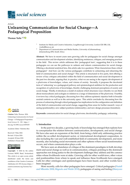 "We have in recent years seen growing calls for pedagogies for social change amongst communication and development scholars, identifying resistances, critiques, and emerging practices in the field. This review article addresses this ‘pedagogical turn’, suggesting that it is in these pedagogies we can see the pathways to unlearn and relearn communication for social change. Offering a decolonial analytical lens, this article asks two questions: What characterizes these critical pedagogies? And how can the various pedagogies contribute to unlearning and relearning the field of communication and social change? This article is structured in five parts, first offering a review of key critiques articulated within the field of communication and social development in the past two decades, arguing that, in practice, what we are seeing is the organic development of a pluriverse of knowledges, values, and visions of society. Secondly, it proposes the decolonial term of ‘unlearning’ as a pedagogical pathway and epistemological ambition for the production and recognition of a pluriverse of knowledges, thereby challenging dominant perceptions of society and social change. Thirdly, it introduces a model of analysis which structures ways whereby we can think about monocultures and ecologies in relation to a range of dimensions of the pluriverse. Fourthly, it reviews key critical pedagogies, discussing how they address epistemic injustice both in broader societal contexts as well as in the university space. This article concludes by discussing how the process of unlearning through critical pedagogies has implications for the configuration and definition of the field of communication and social change, suggesting three areas for further research: ways of seeing (positionality), new subject positions (relationality), and new design processes (transition)." (Abstract)