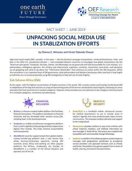 "Social media use has provided access to entertainment, opportunities for a richer social life, and the ability to communicate with many others in a manner that was not possible just a few decades ago. In SSA, the convergence of homegrown ideas and collaboration with the international community has enabled SSA to use SM as an avenue to fill existing and emerging gaps across sectors. What makes the region stand out even more is that the needs of its people are placed at the forefront of these processes. As a result, SSA is innovating SM in ways that significantly improve the lives of those impacted by state fragility." (Conclusion)