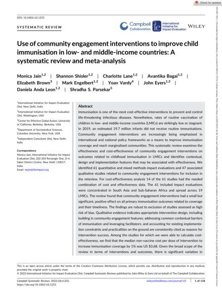 "This systematic review examines the effectiveness and cost-effectiveness of community engagement interventions on outcomes related to childhood immunisation in low- and middle-income countries (LMICs) and identifies contextual, design and implementation features that may be associated with effectiveness. We identified 61 quantitative and mixed methods impact evaluations and 47 associated qualitative studies related to community engagement interventions for inclusion in the review. For cost-effectiveness analysis 14 of the 61 studies had the needed combination of cost and effectiveness data. The 61 included impact evaluations were concentrated in South Asia and Sub-Saharan Africa and spread across 19 LMICs. The review found that community engagement interventions had a small but significant, positive effect on all primary immunisation outcomes related to coverage and their timeliness. The findings are robust to exclusion of studies assessed as high risk of bias. Qualitative evidence indicates appropriate intervention design, including building in community engagement features; addressing common contextual barriers of immunisation and leveraging facilitators; and accounting for existing implementation constraints and practicalities on the ground are consistently cited as reasons for intervention success." (Abstract)