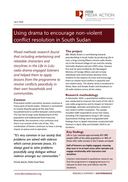 "Mixed methods research found that including entertaining and relatable characters and storylines in the Life in Lulu radio drama engaged listeners and helped them to apply lessons from the programme to resolve conflicts peacefully in their own households and communities." (Page 1)