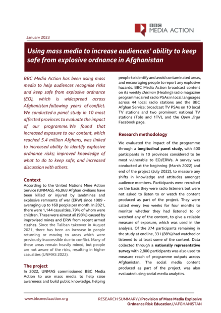 "BBC Media Action has been using mass media to help audiences recognise risks and keep safe from explosive ordnance (EO), which is widespread across Afghanistan following years of conflict. We conducted a panel study in 10 most affected provinces to evaluate the impact of our programme. We found that increased exposure to our content, which reached 5.4 million Afghans, was linked to increased ability to identify explosive ordnance risks; improved knowledge of what to do to keep safe; and increased discussion with others." (Introduction)