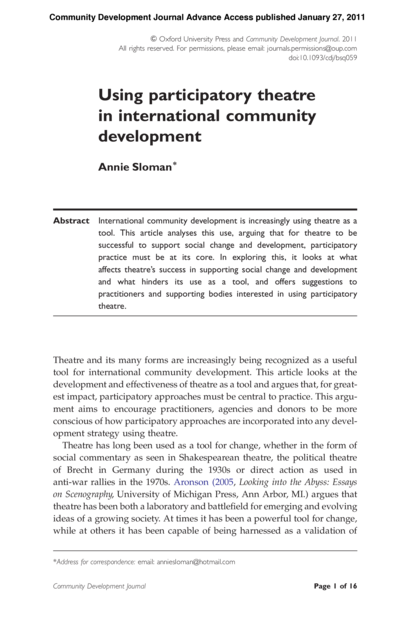 "International community development is increasingly using theatre as a tool. This article analyses this use, arguing that for theatre to be successful to support social change and development, participatory practice must be at its core. In exploring this, it looks at what affects theatre’s success in supporting social change and development and what hinders its use as a tool, and offers suggestions to practitioners and supporting bodies interested in using participatory theatre." (Publisher description)