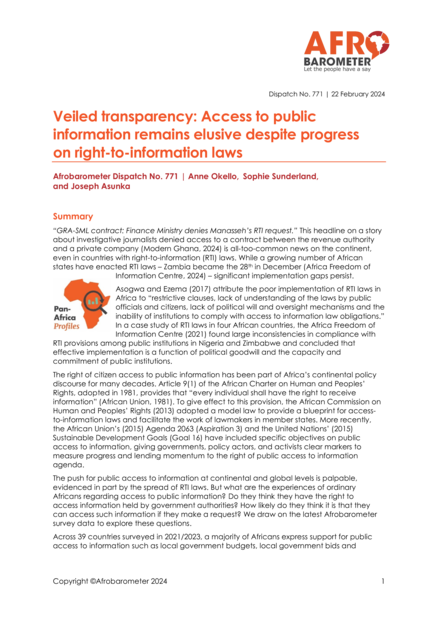 "Across 39 countries surveyed in 2021/2023, a majority of Africans express support for public access to information such as local government budgets, local government bids and contracts, and even the salaries of public officials and teachers. But although demand for public information is high, few citizens think they could obtain such information. While public officials may argue in favour of keeping information secret, the data show that access to information is strongly associated with perceptions of corruption and trust: Citizens are more likely to view their elected leaders as corrupt, and less likely to trust them, in countries where access to information is perceived to be difficult." (Summary, Pages 1-2)