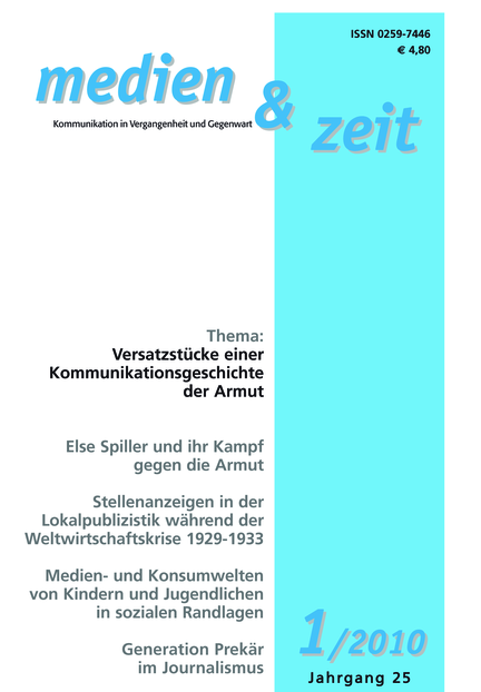 "Wie Armut in Medien ein Gesicht gegeben wurde, durch welche manifesten Kommunikationsinhalte sich auf gesellschaftliche Armutsverhältnisse rückschließen lässt, welche Rollen Medien und deren Konsum im Leben von Armutsbetroffenen einnehmen und wie es den medialen Mittlern von Armut ergeht: Diesen Fragen widmet sich diese Ausgabe anhand einzelner Kristallisationsmomente. Es sind Versatzstücke einer Kommunikationsgeschichte von Armut, die medien&zeit in historischer Erstreckung von 1900 bis heute aufblendet." (Editorial, Seite 3)