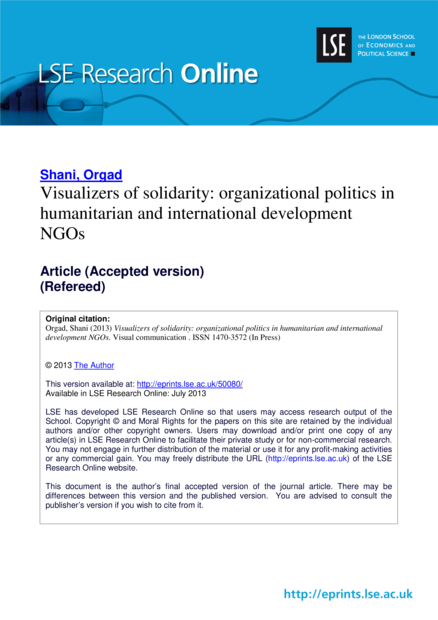 "Discussion of the visual politics of solidarity, in relation specifically to the representation of suffering and development, has been grounded in analysis of images. This paper seeks to expand this debate by exploring the organizational politics that shape and are shaped by these images. The paper is inspired by production studies in the cultural industries and draws on interviews with 17 professionals from 10 UK-based international development and humanitarian organizations, who are engaged in planning and producing imagery of international development and humanitarian issues. It discusses how power relations, tensions, and position-taking shape the arguments and choices made by NGOs producing images of suffering and development. I focus on two arenas of struggle about how to visualize solidarity: (a) intra-organizational politics - specifically tensions within NGOs between fundraising and/or marketing departments, and communications, campaign and/or advocacy departments, and (2) inter-organizational politics: the competing tendencies towards convergence, cohesiveness, and collective identity of the humanitarian sector, and competition, distinction, and divergence between organizations on the other. I show that NGOs' visual production is an area of conflict, negotiation and compromise, and argue for the crucial need for attention to organizational politics in the production of visual representations of distant suffering in order to uncover diverse and competing motivations, and the forces driving current humanitarian and development communications." (Abstract)