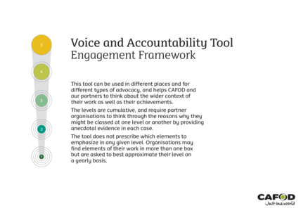 "This tool can be used in different places and for different types of advocacy, and helps CAFOD and our partners to think about the wider context of their work as well as their achievements. The levels are cumulative, and require partner organisations to think through the reasons why they might be classed at one level or another by providing anecdotal evidence in each case. The tool does not prescribe which elements to emphasize in any given level. Organisations may find elements of their work in more than one box but are asked to best approximate their level on a yearly basis." (Page 1)