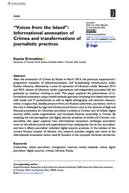 "After the annexation of Crimea by Russia in March 2014, the peninsula experienced a progressive transition of telecommunication and broadcasting infrastructure under Russian influence, followed by a wave of repression of Ukrainian media. Between 2014 and 2015, dozens of Ukrainian media organizations and independent journalists left the peninsula to continue working in exile. This paper explores the phenomenon of informational annexation using a mixed methods approach consisting of in-depth interviews with media and IT professionals as well as digital ethnography and network measurements. It argues that, besides pressure from pro-Russian authorities, journalistic work in the area is challenged by legal and infrastructural factors such as the absence of legal and financial protections for Ukrainian journalists traveling to Crimea, lack of holistic digital security within media organizations, and increased Internet censorship in Crimea. By analyzing the risk perceptions and digital security practices of exiled and Crimean civic journalists, this paper explores how informational annexation challenges journalistic work on the infrastructural and organizational level, enabling the rise of civic journalism, and how it affects journalists' individual digital security practices. In the context of the current Russian invasion of Ukraine, this research provides insights into some of the informational annexation tactics used by Russians in the occupied Ukrainian territories." (Abstract)