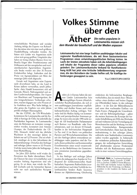 "Lateinamerika hat eine lange Tradition unabhängiger lokaler und regionaler Rundfurikstationen, die mit ihren basisorientierten Programmen einen entwicklungspolitischen Beitrag leisten. Im Laufe der letzten Jahrzehnte haben sich die Arbeitsbedingungen und Inhalte der Programme dieser radios populares erheblich geändert. Der Lateinamerikanische Verband für Rundfunkerziehung ALER hat jetzt eine kritische Selbstbewertung vorgenommen, die den Betreibern der Sender helfen soll, für künftige Anforderungen gewappnet zu sein." (Seite 92)