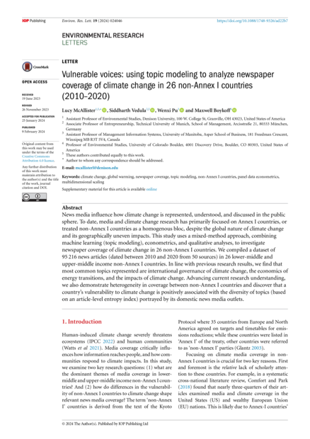 "News media influence how climate change is represented, understood, and discussed in the public sphere. To date, media and climate change research has primarily focused on Annex I countries, or treated non-Annex I countries as a homogenous bloc, despite the global nature of climate change and its geographically uneven impacts. This study uses a mixed-method approach, combining machine learning (topic modeling), econometrics, and qualitative analyses, to investigate newspaper coverage of climate change in 26 non-Annex I countries. We compiled a dataset of 95 216 news articles (dated between 2010 and 2020 from 50 sources) in 26 lower-middle and upper-middle income non-Annex I countries. In line with previous research results, we find that most common topics represented are international governance of climate change, the economics of energy transitions, and the impacts of climate change. Advancing current research understanding, we also demonstrate heterogeneity in coverage between non-Annex I countries and discover that a country’s vulnerability to climate change is positively associated with the diversity of topics (based on an article-level entropy index) portrayed by its domestic news media outlets." (Abstract)