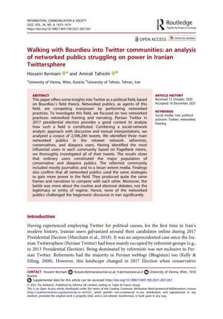 "This paper offers some insights into Twitter as a political field, based on Bourdieu’s field theory. Networked publics, as agents of this field, are competing overpower by performing networked practices. To investigate this field, we focused on two networked practices: networked framing and narrating. Persian Twitter in 2017 presidential election provides a good context to analyze how such a field is constituted. Combining a social-network analytic approach with discursive and textual interpretations, we analyzed a corpus of 2,596,284 tweets. We identified three main networked publics in the retweet network: reformists, conservatives, and diaspora users. Having identified the most influential users in each community based on PageRank metric, we thoroughly investigated all of their tweets. The results show that ordinary users constituted the major population of conservative and diaspora publics. The reformist community included mostly journalists and to a lesser extent media. Findings also confirm that all networked publics used the same strategies to gain more power in the field. They produced quite the same frames and narratives to compete with each other. Moreover, the battle was more about the routine and electoral debates, not the legitimacy or entity of regime. Hence, none of the networked publics challenged the hegemonic discourse in Iran significantly." (Abstract)