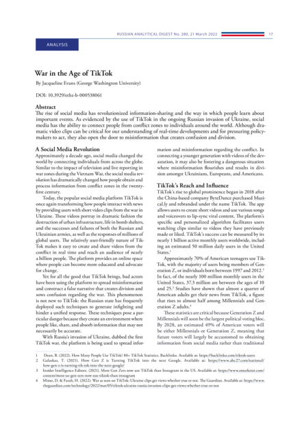 "The rise of social media has revolutionized information-sharing and the way in which people learn about important events. As evidenced by the use of TikTok in the ongoing Russian invasion of Ukraine, social media has the ability to connect people from conflict zones to individuals around the world. Although dramatic video clips can be critical for our understanding of real-time developments and for pressuring policymakers to act, they also open the door to misinformation that creates confusion and division." (Abstract)