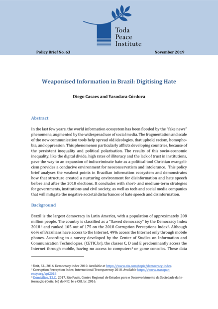 "In the last few years, the world information ecosystem has been flooded by the “fake news” phenomena, augmented by the widespread use of social media. The fragmentation and scale of the new communication tools help spread old ideologies, that uphold racism, homophobia, and oppression. This phenomenon particularly afflicts developing countries, because of the persistent inequality and political polarisation. The results of this socio-economic inequality, like the digital divide, high rates of illiteracy and the lack of trust in institutions, pave the way to an expansion of indiscriminate hate as a political tool Christian evangelicism provides a conducive environment for neoconservatism and intolerance. This policy brief analyses the weakest points in Brazilian information ecosystem and demonstrates how that structure created a nurturing environment for disinformation and hate speech before and after the 2018 elections. It concludes with short- and medium-term strategies for governments, institutions and civil society, as well as tech and social media companies that will mitigate the negative societal disturbances of hate speech and disinformation." (Abstract)