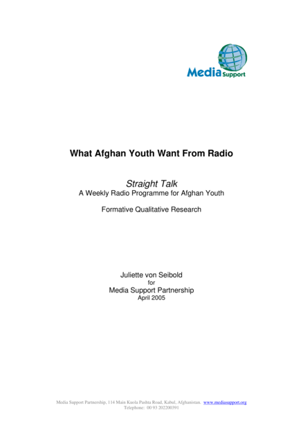 "This is a report of qualitative research into the aspirations of young Afghans aged 15 – 24 years and their radio listening practices. The research was conducted in March 2005 in three major locations: Jalalabad, Mazar-I-Sharif, and Balkh. The findings and recommendations in this report will help guide a group of young Afghans engaged by Media Support Partnership in Kabul, to launch a weekly radio programme called Straight Talk (ST) in September 2005. ST will be aimed at young people and aired in Dari and Pashtu. Researchers interviewed a total of 47 men and 59 women in various locations including high schools, a university campus, youth centres, a shrine and a park. Most interviewees were young people but a small number were parents and teachers. Interviews lasted for 30 – 50 minutes and researchers used a checklist of topics and questions. Individuals were selected randomly to capture a range of characteristics including ethnicity, gender, ever-attended school and never-attended school/madarassa. In terms of ethnic breakdown, the survey respondents include Pashtoons, Uzbeks, Tajiks and Peshaii speakers. In terms of socio-economic diversity, three groups are broadly represented: middle, low, and very low income." (Executive summary, page 4)