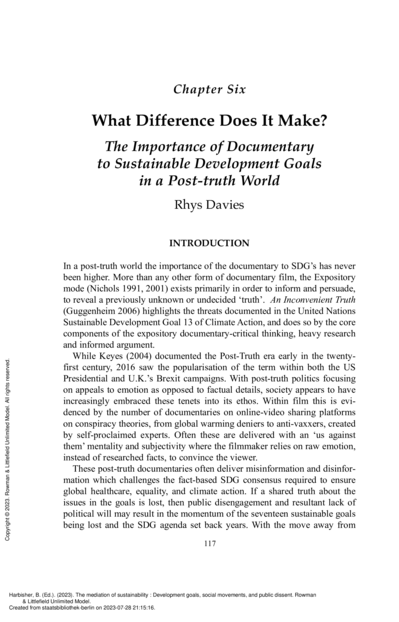 "The landscape of documentaries has changed greatly in the twenty-first century. From a niche form, with few productions, to global distribution via social media. Post-truth documentaries largely have a sense of outsiders challenging the status quo, delivered by self-proclaimed experts with anecdote and emotions central to the power of message delivered on free online platforms. In a world of fake news and alternative facts the documentary can still be a device which highlights the SDG issues, engages audiences and promotes discussion. They can be part of a system of regaining the public trust to encourage the political will to continue the agenda and meet the goals. In a post-truth era maybe people need a different form of documentary, one that while continuing critical thinking and research, moves from the expository to other modes or hybrids to inform the debate on SDG’s. Documentaries that are more inclusive then ‘I speaking about us to you’, less patronising than ‘I speaking about them to you’." (Conclusion)