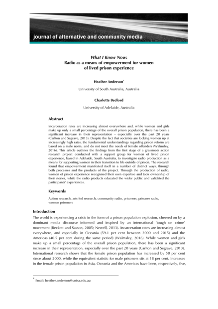 "This article outlines the findings from the first stage of a grassroots action research project conducted with a support group for women of lived prison experience, based in Adelaide, South Australia, to investigate radio production as a means for supporting women in their transition to life outside of prison. The research found that empowerment manifested itself in a number of distinct ways, through both processes and the products of the project. Through the production of radio, women of prison experience recognised their own expertise and took ownership of their stories, while the radio products educated the wider public and validated the participants’ experiences." (Abstract)