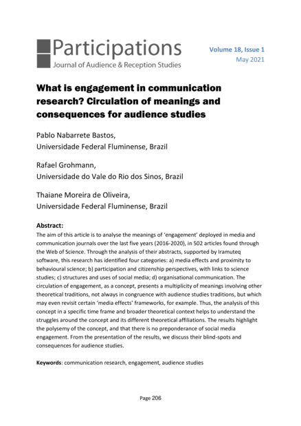 "The aim of this article is to analyse the meanings of ‘engagement’ deployed in media and communication journals over the last five years (2016-2020), in 502 articles found through the Web of Science. Through the analysis of their abstracts, supported by Iramuteq software, this research has identified four categories: a) media effects and proximity to behavioural science; b) participation and citizenship perspectives, with links to science studies; c) structures and uses of social media; d) organisational communication. The circulation of engagement, as a concept, presents a multiplicity of meanings involving other theoretical traditions, not always in congruence with audience studies traditions, but which may even revisit certain ‘media effects’ frameworks, for example. Thus, the analysis of this concept in a specific time frame and broader theoretical context helps to understand the struggles around the concept and its different theoretical affiliations. The results highlight the polysemy of the concept, and that there is no preponderance of social media engagement. From the presentation of the results, we discuss their blind-spots and consequences for audience studies." (Abstract)