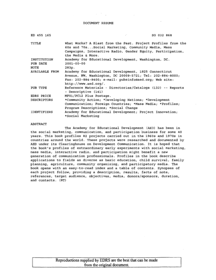 What Works? A Blast from the Past: Project Profiles from the 60s and 70s... Social Marketing, Community Media, Mass Campaigns, Interactive Radio, Gender Equity, Participation, the Media and More