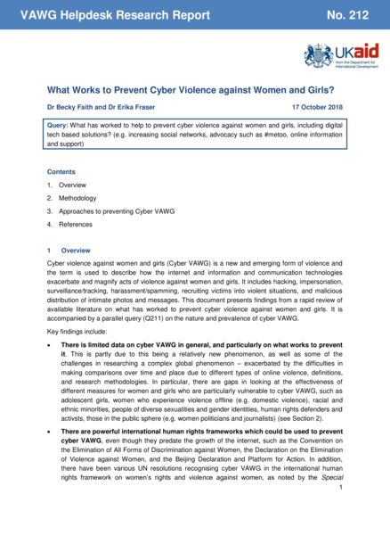 "This document presents findings from a rapid review of available literature on what has worked to prevent cyber violence against women and girls. Key findings include: There is limited data on cyber violence against women and girls (VAWG) in general, and particularly on what works to prevent it [...] There are powerful international human rights frameworks which could be used to prevent cyber VAWG [...] However, the effectiveness of international human rights frameworks and laws is constrained by gaps in specialised national legislative and policy measures, mechanisms, procedures and expertise/skills [...] There are guidelines for social media companies but there are severe problems in getting them to enforce them/follow up [...] School-based interventions have potential to take primary prevention of cyber VAWG to scale [...] Various apps and online tools have been developed, but these are mostly not evaluated [...] Importance of contextualised, bottom up responses which acknowledge and address socio-cultural norms [...] Social media and the internet have also been used by women for online advocacy to combat VAWG." (Overview, page 1-2)