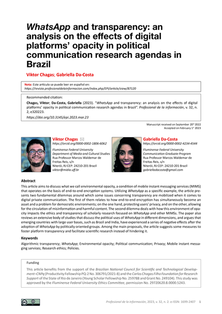 "This article aims to discuss what we call environmental opacity, a condition of mobile instant messaging services (MIMS) that operates on the basis of end-to-end encryption systems. Utilizing WhatsApp as a specific example, the article presents two fundamental dilemmas around which some issues concerning transparency are mobilized when it comes to digital private communication. The first of them relates to how end-to-end encryption has simultaneously become an asset and a problem for democratic environments; on the one hand, protecting users’ privacy, and on the other, allowing for the circulation of misinformation and harmful content. The second dilemma deals with how this environment of opacity impacts the ethics and transparency of scholarly research focused on WhatsApp and other MIMSs. The paper also reviews an extensive body of studies that discuss the political uses of WhatsApp in different dimensions, and argues that emerging countries with large user bases, such as Brazil and India, have experienced a series of negative effects after the adoption of WhatsApp by politically oriented groups. Among the main proposals, the article suggests some measures to foster platform transparency and facilitate scientific research instead of hindering it." (Abstract)