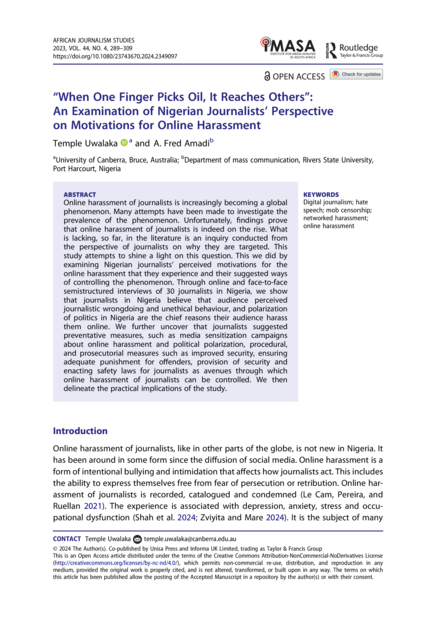 "Online harassment of journalists is increasingly becoming a global phenomenon. Many attempts have been made to investigate the prevalence of the phenomenon. Unfortunately, findings prove that online harassment of journalists is indeed on the rise. What is lacking, so far, in the literature is an inquiry conducted from the perspective of journalists on why they are targeted. This study attempts to shine a light on this question. This we did by examining Nigerian journalists’ perceived motivations for the online harassment that they experience and their suggested ways of controlling the phenomenon. Through online and face-to-face semistructured interviews of 30 journalists in Nigeria, we show that journalists in Nigeria believe that audience perceived journalistic wrongdoing and unethical behaviour, and polarization of politics in Nigeria are the chief reasons their audience harass them online. We further uncover that journalists suggested preventative measures, such as media sensitization campaigns about online harassment and political polarization, procedural, and prosecutorial measures such as improved security, ensuring adequate punishment for offenders, provision of security and enacting safety laws for journalists as avenues through which online harassment of journalists can be controlled. We then delineate the practical implications of the study." (Abstract)