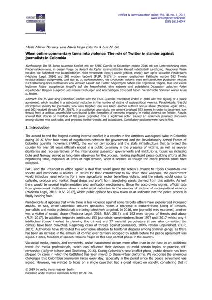 "The 55-year long Colombian conflict with the FARC guerrilla movement ended in 2016 with the signing of a peace agreement, which resulted in a substantial reduction in the number of victims of socio-political violence. Paradoxically, this did not improve security for journalists, who were targeted: one was killed, another suffered sexual abuse, and 262 received threats. In a qualitative case study, we content analyzed 592 tweets in order to document how threats from a political powerholder contributed to the formation of networks engaging in verbal violence on Twitter. Results showed that attacks on freedom of the press originated from a legitimate actor, caused an extremely polarized discussion among citizens who took sides, and provoked further threats and accusations. Conciliatory positions were hard to find." (Abstract)